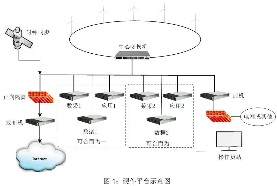 風(fēng)場監(jiān)控系統(tǒng)布置于風(fēng)場監(jiān)控室內(nèi),由風(fēng)機(jī)監(jiān)控系統(tǒng)、風(fēng)電場功率管理系統(tǒng)(能量管理系統(tǒng))、第三方接口系統(tǒng)組成。其主要包括風(fēng)機(jī)監(jiān)控、數(shù)據(jù)采集、數(shù)據(jù)存儲(chǔ)、數(shù)據(jù)查詢、數(shù)據(jù)呈現(xiàn)、Web發(fā)布、風(fēng)機(jī)管理、風(fēng)場調(diào)度、安全審計(jì)等功能。